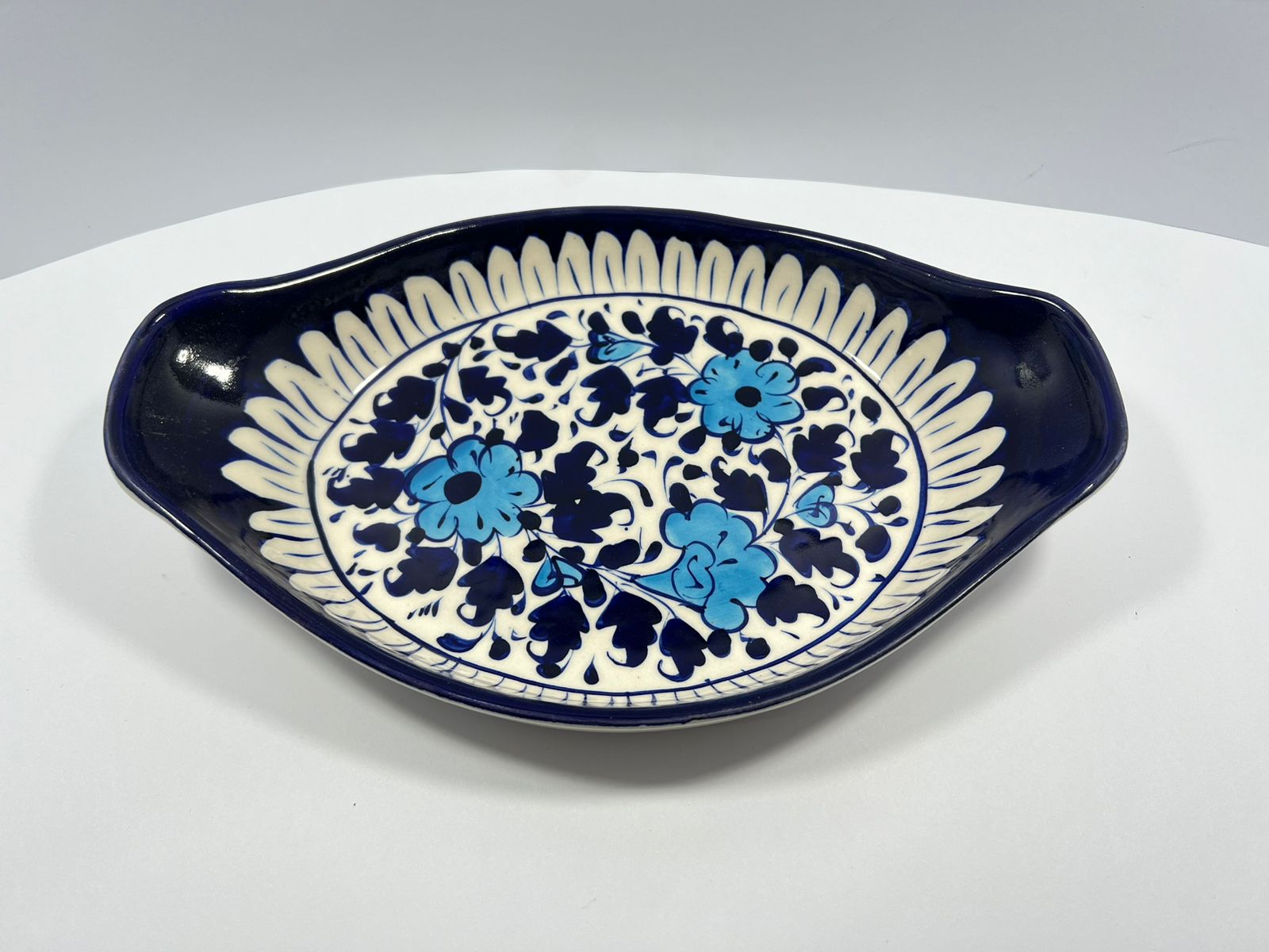 Elevate your serveware with this stunning blue pottery tray with handles, a handcrafted piece that brings together artistic heritage and practical design. Featuring traditional hand-painted motifs in rich blue hues, this tray is both decorative and functional.