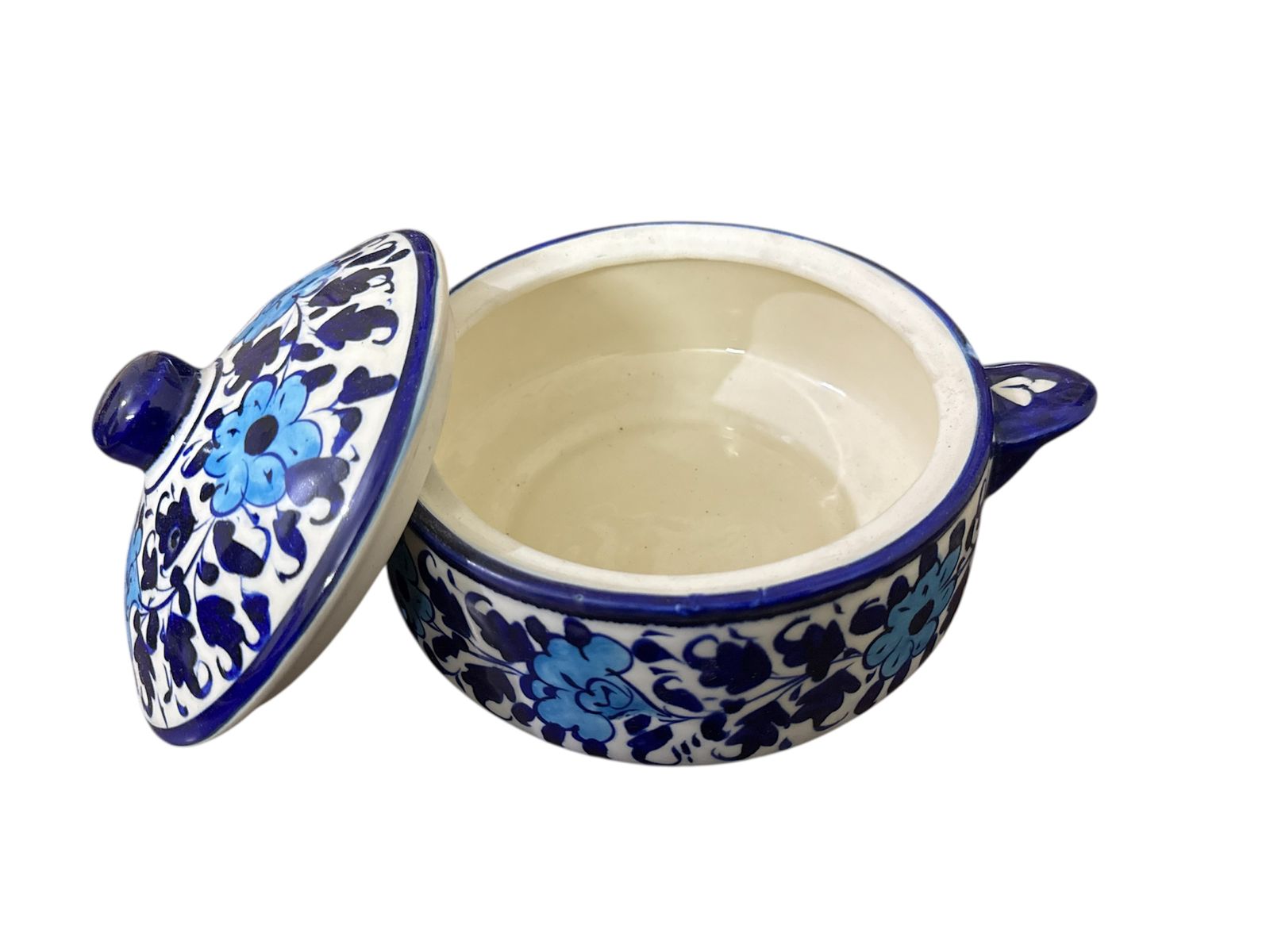 Elevate your serveware collection with our Handcrafted Blue Pottery Round Bowl, complete with a snug-fitting lid and side handles for easy use. This beautifully detailed piece is crafted using the age-old Jaipur blue pottery technique, bringing timeless elegance and everyday functionality to your kitchen or dining space.
